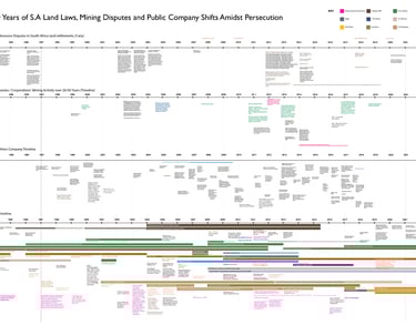 This map shows the shifting seats of public and private entities' power, events affecting communities and the family in question who's company owns the mining rights. A dive into correllation of these timelines against the events that were happening simultaneously.