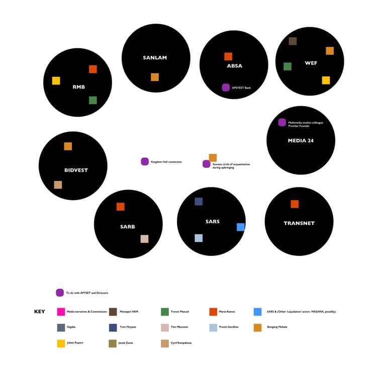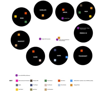 This is a different way we tried to look at the relationships that connected people and organizations. A look at how they could have possibly collided with our issues. Derived from Correllation: 30 Years of South African Land Laws, Mining Disputes and Public Company Shifts Amidst Persecution of a Family of Jehovah's Witnesses, using the same key.